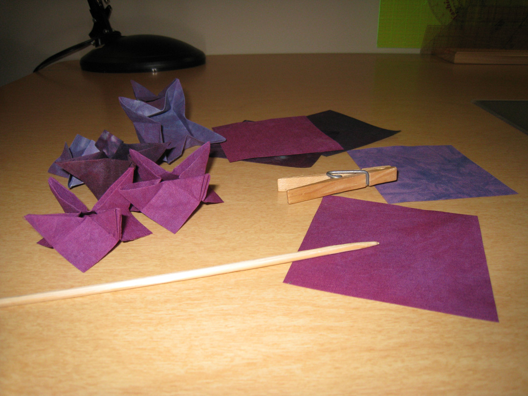 I folded the purples, pinks and magenta squares back and forth, just as I had done with the paper 'sample flower' I had saved all these years. It worked in fabric, too!